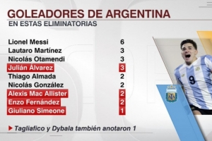 ESPN统计了阿根廷球员本届世预赛的进球数量,并列出榜单,梅西以6球居首,劳塔罗、奥塔门迪、阿尔瓦雷斯3球次席。